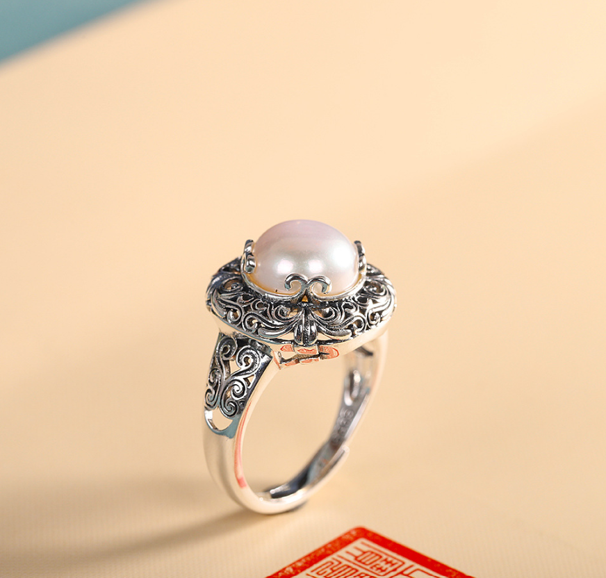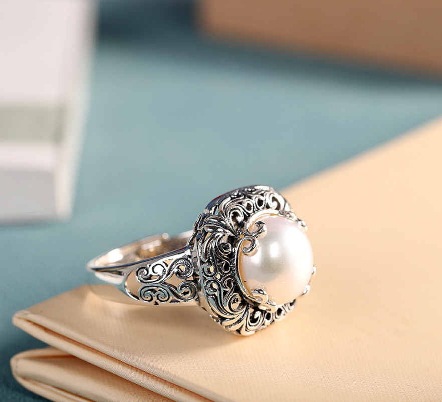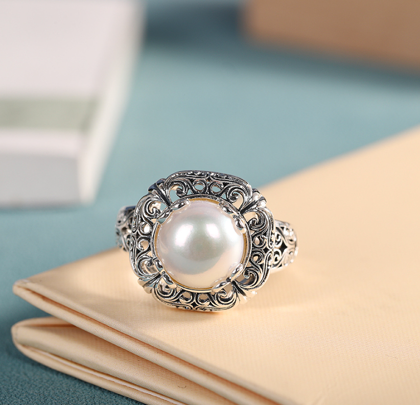 Personality Silver S925 Sterling Silver Inlaid Freshwater Pearl Ring Vintage Fashion Simple Hollow Women’s Open Ring