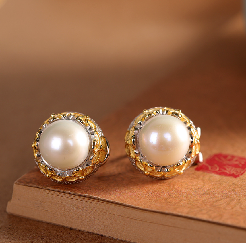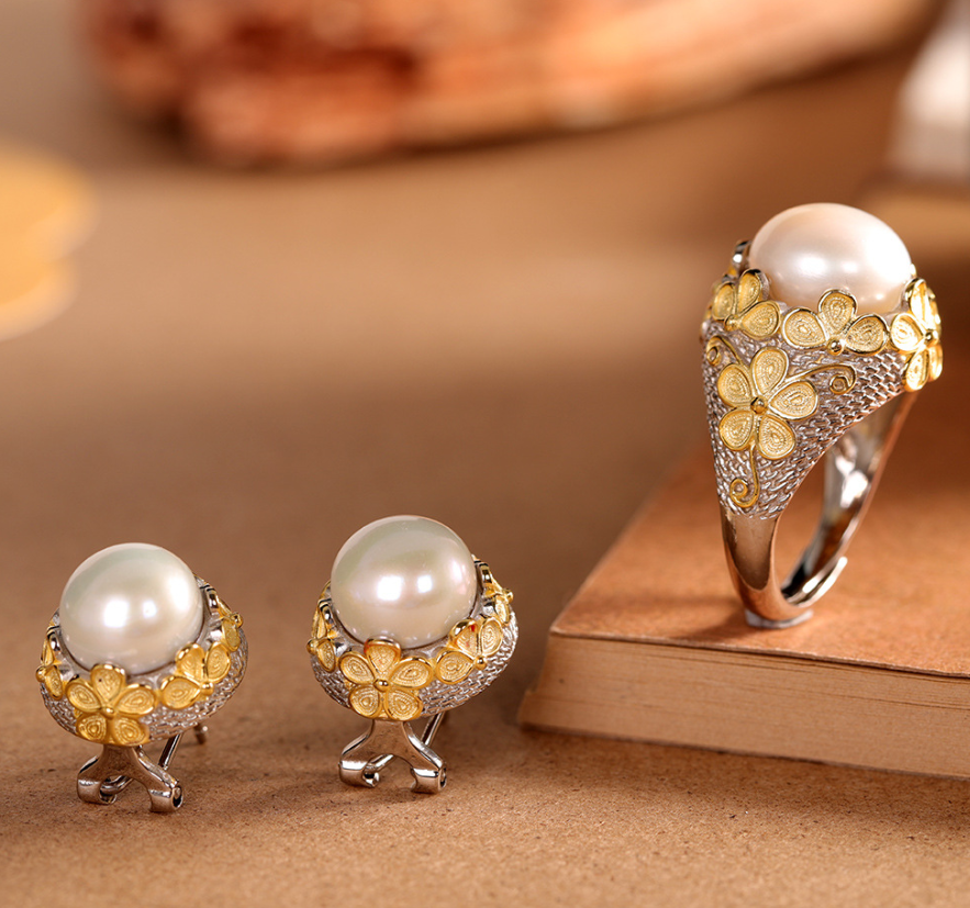 The character silver S925 silver silk inlaid pearl ring national tide flower temperament artistic luxury atmospheric earrings