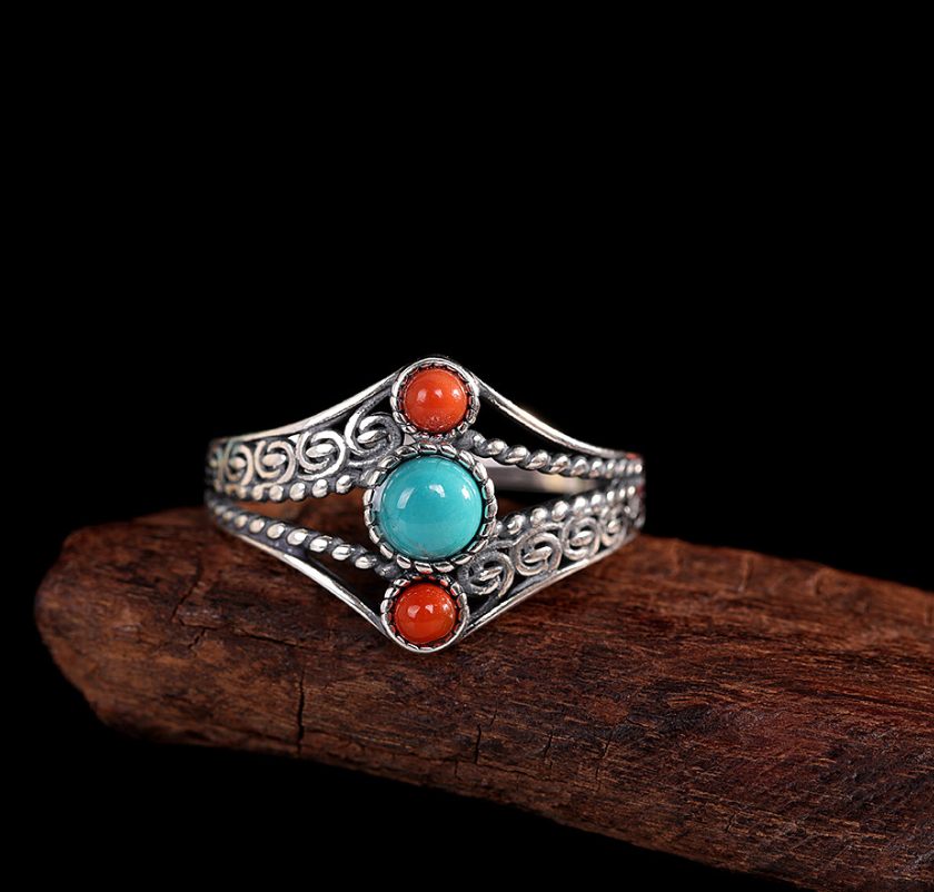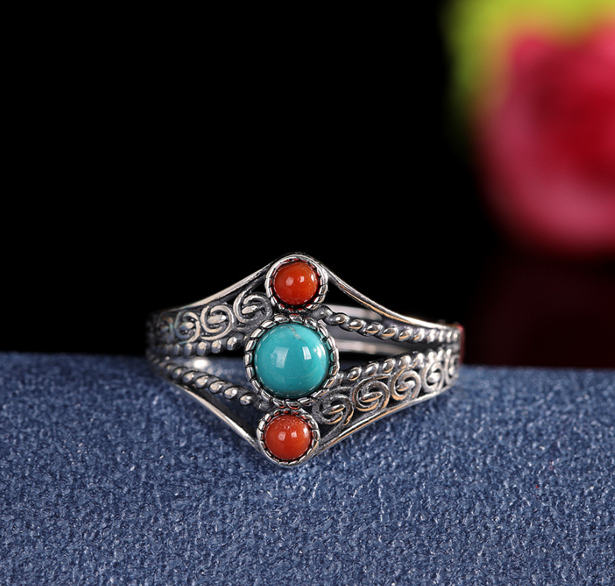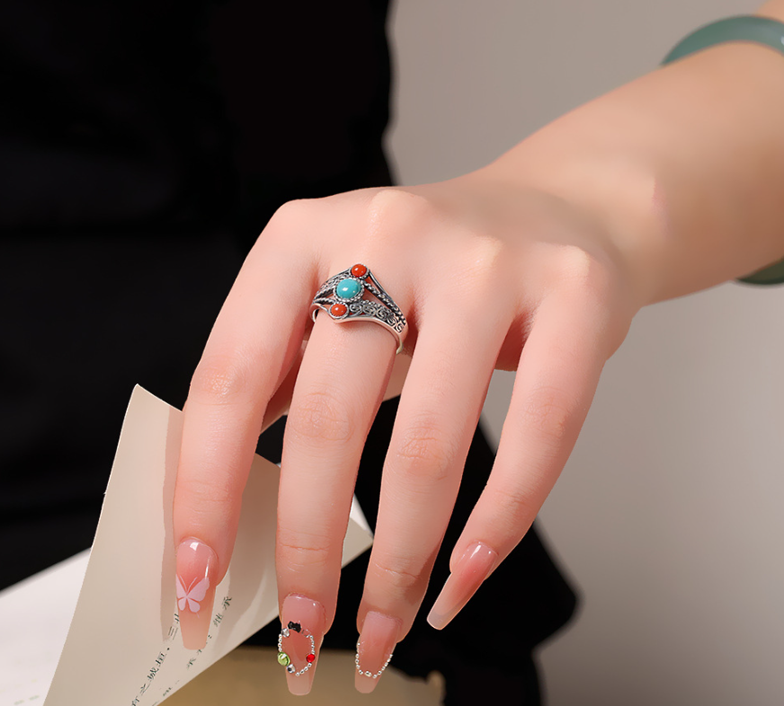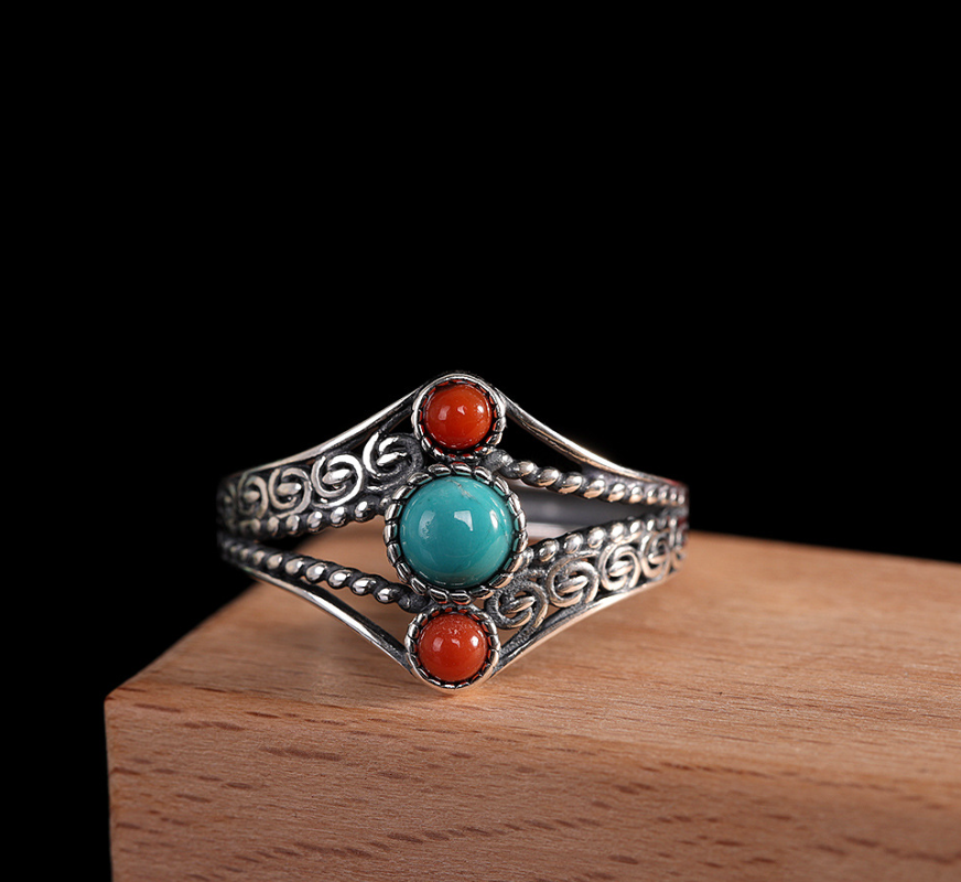 Personality and Elegance S925 Sterling Silver Inlaid with Turquoise and Southern Red Agate Ring, Fashionable Ethnic Style, Adjustable Vintage Ring